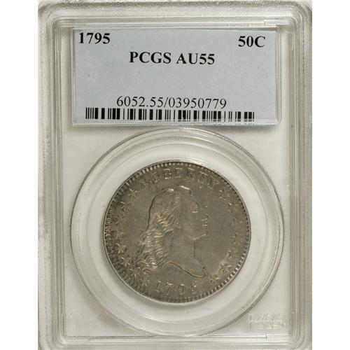 <B>1795 50C 2 Leaves AU55 PCGS.</B></I> O-102, R.4. This piece is an intermediate die state, the obverse meeting Overton's requirements for O-102a and the reverse perfect as an O-102. It is also one of the finest known examples of the die marriage. In the fourth edition of Overton, Don Parsley recorded the Condition Census as 55, 45, 40, 30, 30. The finest examples to appear in recent auctions (and the only AU grade coins) are an AU55 ANACS piece that we sold in November 2003 and an uncertified AU50 sold by Stack's in May 2001. Each side has a few minor scuffs and abrasions, but the overall eye appeal of this example is excellent. Satiny pale gray surfaces exhibit sharp design features with nearly full luster, accented by delightful gold and iridescent toning.<BR><BR><b>Shipping:</b> Coins & Currency (<a target="_blank" href="http://www.heritageauctions.com/common/shipping.php">view shipping information</a>)