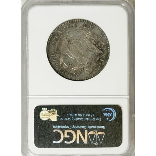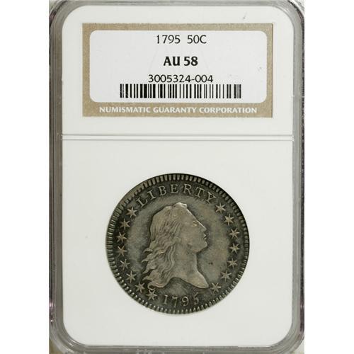 <B>1795 50C 2 Leaves AU58 NGC.</B></I> O-104, R.4. This variety is promptly identified by the die defect lump below star 15, while two points of star 1 nearly touch the closed curl. There are two small defect lumps on the B in LIBERTY. This original-looking coin shows just momentary circulation that has lightly brushed against its beautiful surfaces. The lilac-gray centers cede to cobalt-blue at the obverse rim, while the reverse is a more uniform lilac-gray. This reverse die was used for several die pairings, but the dentilation above RI is clashed and brought into the fields, and several other nearby dentils show doubling from clashes. A wealth of fine detail is present in Liberty's hair and the eagle's breast and wings. An interesting and very scarce coin for the die state specialist.<BR><BR><b>Shipping:</b> Coins & Currency (<a target="_blank" href="http://www.heritageauctions.com/common/shipping.php">view shipping information</a>)