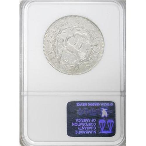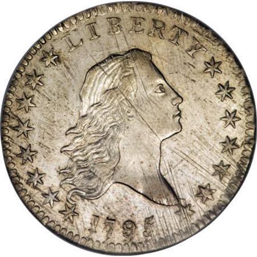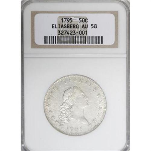 <B>1795 50C 2 Leaves AU58 NGC.</B></I> O-112 prime, R.4. Although somewhat obscured by the adjustment marks, the obverse has a light vertical die crack from the border to hair, passing through the outer left serif of the R. A second faint die crack joins stars 3 through 6. Light clash marks are also evident in the obverse fields, while the reverse appears to be perfect.<BR> A lightly toned Condition Census example of this well known variety. NGC has certified 17 examples of O-112, the two finest as AU50 and AU58. PCGS has encapsulated 14 pieces as the 1795/1795 variety, none above the XF45 level. This piece is certified without a variety notation, and undoubtedly other O-112 examples reside in undesignated NGC and PCGS holders. Nonetheless, the present piece is clearly among the finest known, and it was also cataloged as such for its appearance as lot 1667 in the April 1997 Bowers and Merena catalog of the legendary Louis E. Eliasberg, Sr. Collection. This near-Mint half dollar has partial cartwheel luster, and the surfaces are smooth aside from the mint-made adjustment marks and clash marks that frequent the obverse. Sharply struck save for the eagle's belly and perch.<BR> We believe this piece is the second finest known example of the Repunched Date half dollar variety, behind an almost-unbelievable Gem from the famous St. Oswald Collection.<BR> Haseltine-4; Beistle 4-G; Overton-28; Hilt 16-Z; PCGS# 6055; Encyclopedia-4562.<BR><I>Ex: Louis E. Eliasberg, Sr. Collection (Bowers and Merena, 4/1997), lot 1667; 2007 FUN Auction (Heritage, 1/2007), lot 953.<BR>From The Westmoreland County Collection of Early Bust Halves, 1794-1807.</B></I><BR><BR><B>Coin Engraver:</B> Robert Scot<BR><BR><b>Shipping:</b> Coins & Currency (<a target="_blank" href="http://www.heritageauctions.com/common/shipping.php">view shipping information</a>)