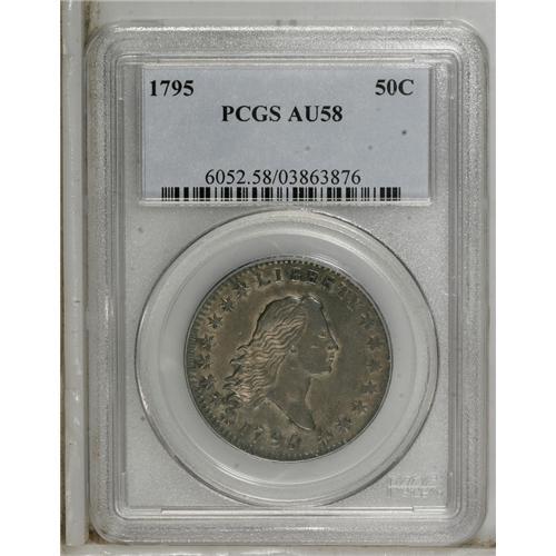 <B>1795 50C 2 Leaves AU58 PCGS.</B></I> O-103, R.5. Although not the rarest 1795 half dollar variety, this piece is one of the finest we have seen, and is better than anything recorded by Steve Herrman in recent auction sales. The best examples that he records are an NGC AU53 that last appeared in August 2001, an XF45 in October 1992, and two different XF40 coins in 1996. Examples of this variety grading VF30 and VF25 are the best that have appeared at auction in the last five years.<BR> This piece is an intermediate die state with extensive obverse and reverse die cracks, but struck before examples of O-103a with its large reverse rim break. It is fully lustrous with satiny surfaces beneath golden-brown color and lovely iridescent toning, with some lighter ivory representing the original mint brilliance. Some rim imperfections on each side are the result of edge lettering creating small voids in the obverse and reverse borders, and these are entirely consistent with the manufacturing process when this piece was first coined.<BR><BR><b>Shipping:</b> Coins & Currency (<a target="_blank" href="http://www.heritageauctions.com/common/shipping.php">view shipping information</a>)