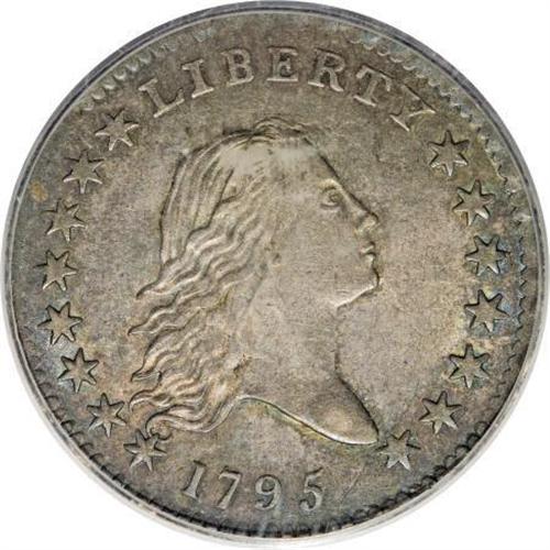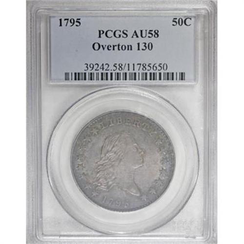 <B>1795 50C 2 Leaves AU58 PCGS.</B></I> O-130, Low R.5. The variety is most easily identifiable by the unique 7-10 berry arrangement on the reverse, the only such layout on 1795 halves. On the obverse, faint clash marks can be seen, along with a diagonal ridge from Liberty's temple to the ear lobe and the hair curls behind the neck. In all likelihood, this is probably the result of a defect in the head punch. The reverse has a series of short die cracks: from the final S to the center of OF, from the tops of OF to the center of A, and from the top of A to the top of MER.<BR> An impressive example, one of the finest known, with natural lilac-gray surfaces enhanced by iridescent toning on both sides. The surfaces have nearly full luster beneath the toning. The only trace of wear is located in the center of the reverse. <BR> The Condition Census in Overton for this variety is woefully inadequate. The finest coin listed there is an AU50. Stephen Herrman's <I>Auction & Mail Bid Prices Realized</B></I> list six auction appearances of Mint State coins, but these include duplicates. The current Census appears to include an MS63, an MS60, and this AU58. The MS63 coin has noticeable obverse adjustment marks, and the MS60 appears to be no finer than this piece. In fact, this example is the most attractive of the Census pieces, despite the lower grade of PCGS.<BR> Haseltine-22; Beistle 13-U; Overton-63; Hilt 13-K; PCGS# 6052, 39242; Encyclopedia-4558.<BR><I>Purchased by John Jay Pittman from F.K Saab on 1/19/1955 for $55; John Jay Pittman Collection (Akers, 5/98), lot 1441; Hain Family Collection, Part II (Stack's, 1/2002), lot 1217; Jim McGuigan (1/2002).<BR>From The Westmoreland County Collection of Early Bust Halves, 1794-1807.</B></I><BR><BR><B>Coin Engraver:</B> Robert Scot<BR><BR><b>Shipping:</b> Coins & Currency (<a target="_blank" href="http://www.heritageauctions.com/common/shipping.php">view shipping information</a>)
