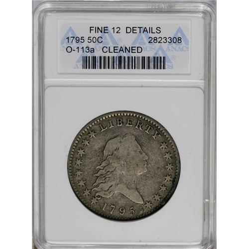 <B>1795<50C> 2 Leaves--Cleaned--ANACS. Fine 12 Details.</B></I> O-113a, R.4. The popular variety with the A in STATES struck over an E. Dusky charcoal-gray surfaces exhibit minuscule marks throughout the obverse field and near the eagle's beak.