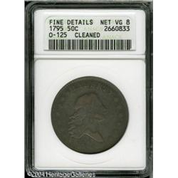 1795 50C 2 Leaves--Cleaned--ANACS. Fine Details, Net <B>1795 50C 2 Leaves--Cleaned--ANACS. Fine Details, Net VG8.</B></I> O-125, R.5. Lush lavender, ocean-blue, and apple-green colors bathe this nicely detailed Flowing Hair Half. The bottom of the date is worn but legible, and adjustment marks along the reverse border are of mint origin. <BR><BR><B>Important notice:</B> Heritage usually auctions material at the rate of 200-250 lots per hour. On some occasions eBay Live bid software or the Internet may not be able to keep up with the pace of the auction. We recommend placing a realistic absentee bid now as insurance to avoid disappointment. Occasionally the auctioneer may eliminate or reject an eBay Live bid, and the auctioneer may also reopen a lot after the close of the eBay live bidding (usually because we missed an audience bid), and may reject your bid even if it shows you as the winning bidder. By bidding via eBay Live, you agree that Heritage may award the lot to another bidder at its sole discretion under the circumstances described above or any other reasonable circumstances. Since eBay bids are not shown to us until we open the lot on the floor, we treat those bids just like floor bids. In most cases the floor responds before the eBay bid is presented to us, due to Internet lag time, so for consistency we have made it a policy that floor bids are always considered first over tie eBay live bids. Also please note that all Heritage lots purchased through eBay Live carry a 20% Buyer's Premium. Please make sure you read the Terms and Conditions before you bid. This lot is being auctioned in conjunction with a live floor auction by Heritage Galleries & Auctioneers. All final auction and invoice information will be supplied by Heritage Galleries & Auctioneers, and all other information should be considered preliminary. Lot:6029