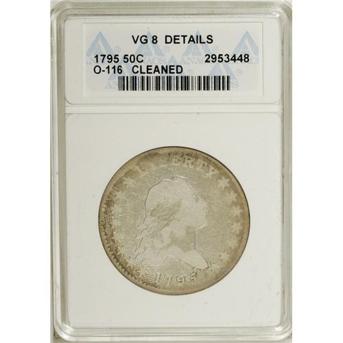 <B>1795 50C 2 Leaves--Cleaned--ANACS. VG 8 Details.</B></I> O-116. NGC Census: (119/1271). PCGS Population (113/853). Mintage: 299,680. Numismedia Wsl. Price: $850. (#6052)<BR><BR><b>Shipping:</b> Coins & Currency (<a target="_blank" href="http://www.heritageauctions.com/common/shipping.php">view shipping information</a>)