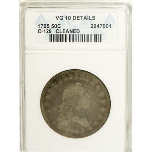 <B>1795 50C 2 Leaves--Cleaned--ANACS. VG10 Details.</B></I> O-125, High R.4. This glossy dove-gray and copper-brown example exhibits significant wear, particularly to the left. Light digs are scattered in the obverse fields, and an X is scratched on the eagle's breast.<BR><BR><b>Shipping:</b> Coins & Currency (<a target="_blank" href="http://www.heritageauctions.com/common/shipping.php">view shipping information</a>)