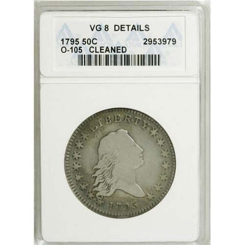 <B>1795 50C 2 Leaves--Cleaned--ANACS. VG8 Details.</B></I> O-105. NGC Census: (118/1271). PCGS Population (113/853). Mintage: 299,680. Numismedia Wsl. Price: $850. (#6052)<BR><BR><b>Shipping:</b> Coins & Currency (<a target="_blank" href="http://www.heritageauctions.com/common/shipping.php">view shipping information</a>)
