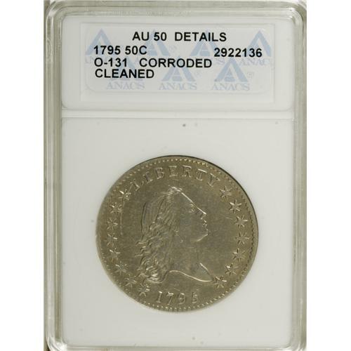 <B>1795 50C 2 Leaves--Corroded, Cleaned--ANACS. AU50 Details.</B></I> O-131, High R.4. A sharp and lightly toned piece with pleasing remaining luster. A bit bright from a cleaning, and the A in STATES is encompassed by verdigris. The reverse rim has a couple of small nicks, and a pair of minor laminations are noted on the lower reverse.<BR><BR><b>Shipping:</b> Coin/Currency (<a target="_blank" href="http://www.heritageauctions.com/common/shipping.php">view shipping information</a>)