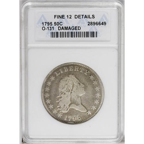 <B>1795<50C> 2 Leaves--Damaged--ANACS. Fine 12 Details.</B></I> O-131, High R.4. Numerous pockmarks pepper the obverse devices of this dove-gray and pewter-gray piece. Moderately worn with a rim bruise just to the left of 6 o'clock on the obverse.
