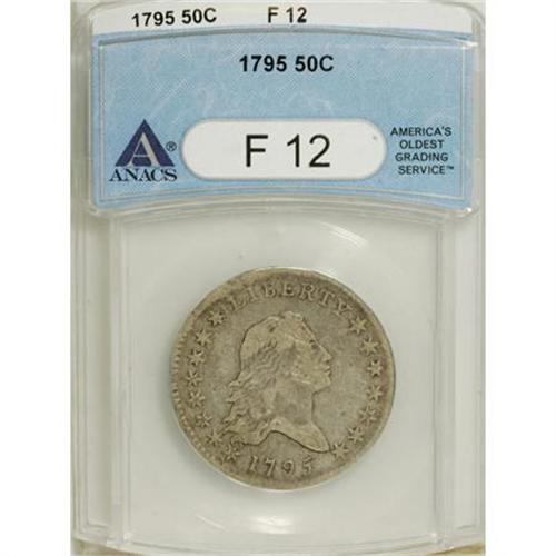 <B>1795 50C 2 Leaves Fine 12 ANACS.</B></I> O-116, R.4. Die cracks near the lower left obverse stars help attribute this collectible Flowing Hair die pairing. This silver-gray example possesses noticeable hair and plumage definition, and the slightly cloudy surfaces lack individually mentionable abrasions.<BR><BR><b>Shipping:</b> Coins & Currency (<a target="_blank" href="http://www.heritageauctions.com/common/shipping.php">view shipping information</a>)