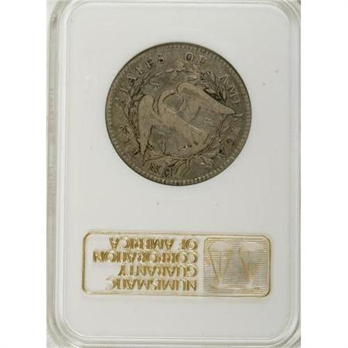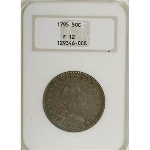 <B>1795 50C 2 Leaves Fine 12 NGC.</B></I> O-113a, R.4. Olive and aqua shades bathe this elusive Flowing Hair type coin. The central reverse has a few faint adjustment marks, as made, and reverse protected areas display minor dark buildup. Certified in an early generation, pre-hologram NGC holder.<BR><BR><B>Coin Engraver:</B> Robert Scot<BR><BR><b>Shipping:</b> Coins & Currency (<a target="_blank" href="http://www.heritageauctions.com/common/shipping.php">view shipping information</a>)