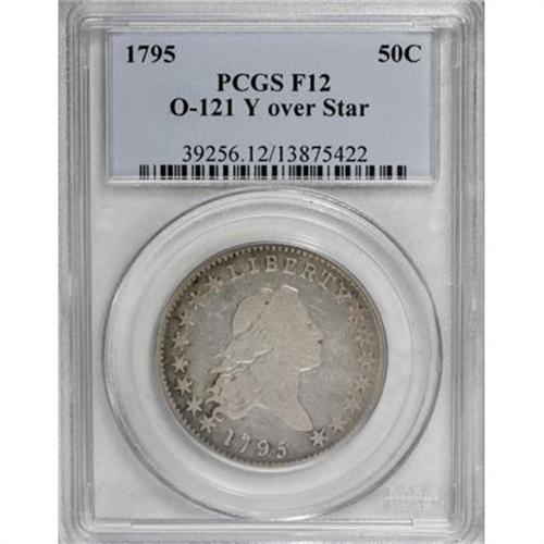 <B>1795 50C 2 Leaves Fine 12 PCGS.</B></I> O-121, High R.4. The attachment of star 1 to the left base of the first curl, the Y of LIBERTY punched over an errant star, a recut CA in AMERICA, and the connection of the lower leaf to the lower right serif of the left stand in the last A in AMERICA confirm this very scarce variety.<BR>Semi-bright, silver-gray surfaces display whispers of olive-tan at the margins of this Fine example. Some definition is apparent on Liberty's jaw line and hair strands, and on the eagle's internal plumage, and all of the dentilation is visible, except for that along the right obverse border. Both sides exhibit remarkably clean surfaces, and are devoid of adjustment marks.<BR>Haseltine-18; Beistle 18-P; Overton-46; Hilt 11-E; PCGS# 6052; Encyclopedia-4554.<BR><I>Ex: Alpine Numismatics (10/2003).<BR>From The Westmoreland County Collection of Early Bust Halves, 1794-1807.</B></I><BR><BR><B>Coin Engraver:</B> Robert Scot<BR><BR><b>Shipping:</b> Coins & Currency (<a target="_blank" href="http://www.heritageauctions.com/common/shipping.php">view shipping information</a>)
