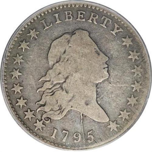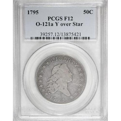 <B>1795 50C 2 Leaves Fine 12 PCGS.</B></I> O-121a, R.5. The diagnostic heavy crack travels from the rim roughly midway between the 9 and 5 of the date to the bust. While Overton (third edition) writes that this crack extends: " ... about halfway across the neck," it is not evident on this VG10 example. No other cracks are apparent on either side.<BR> Light gray patination assumes a slightly deeper hue in some of the recesses. Well-centered design features exhibit a good amount of detail for the grade, though some minor weakness is noted along the right borders of both obverse and reverse. Close scrutiny with a loupe reveals no mentionable contact marks, though we note some light adjustment marks at the lower and right obverse border.<BR> Haseltine-18; Beistle 18a-P; Overton-47; Hilt 11-E; PCGS# 6052; Encyclopedia-4554.<BR><I>Ex: Michael Summers (2/2004).<BR>From The Westmoreland County Collection of Early Bust Halves, 1794-1807.</B></I><BR><BR><B>Coin Engraver:</B> Robert Scot<BR><BR><b>Shipping:</b> Coins & Currency (<a target="_blank" href="http://www.heritageauctions.com/common/shipping.php">view shipping information</a>)