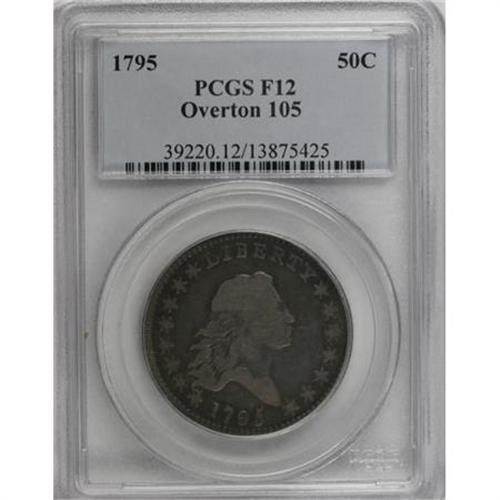 <B>1795 50C 2 Leaves Fine 12 PCGS.</B></I> O-105a, High R.3. Reverse C was used with three different obverse dies to coin O-103, 104, and 105. The emission sequence for these three dies is clearly O-104, 105, and 103. The reverse has die cracks through I of UNITED (unlisted in Overton), the first A of AMERICA (Overton says second A), and the C, although the crack through A is not readily visible due to wear or a weak strike. Apparently a large number of halves were struck from this die pair as numerous examples are known today.<BR> The surfaces show a few grade-consistent marks and light scratches, the most notable on Liberty's neck, two in the right obverse field, and a shallow scratch across the neck of the eagle. However, the visual effect is minimal, as both sides are covered with light gray patina that has contrasting pinkish-gray devices.<BR> Haseltine-8; Beistle 8-B; Overton-11; Hilt 17-O; PCGS #6052; <I>Encyclopedia</B></I>-4560.<BR><I>Ex: Dick Osburn (8/2006).<BR>From The Westmoreland County Collection of Early Bust Halves, Part Two.</B></I><BR><BR><b>Shipping:</b> Coins & Currency (<a target="_blank" href="http://www.heritageauctions.com/common/shipping.php">view shipping information</a>)