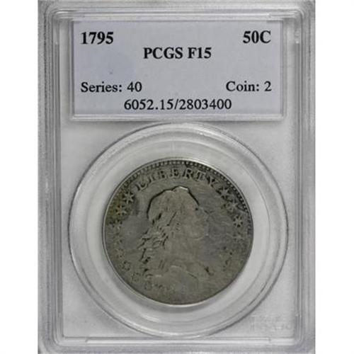 <B>1795 50C 2 Leaves Fine 15 PCGS.</B></I> O-110, R.3. Pearl-gray and golden-brown toning contributes to the charm of this nicely detailed Flowing Hair half. The die alignment causes softer definition between 4 and 6 o'clock on the obverse, and opposite on the reverse between 12 and 2 o'clock. The obverse border has minor mint-produced adjustment marks. Faint hairlines on the portrait are consistent with the grade.<BR><BR><B>Coin Engraver:</B> Robert Scot<BR><BR><b>Shipping:</b> Coins & Currency (<a target="_blank" href="http://www.heritageauctions.com/common/shipping.php">view shipping information</a>)