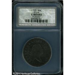 1795 50C 2 Leaves, Good Details, Plugged, NCS. O-1 <B>1795 50C 2 Leaves, Good Details, Plugged, NCS.</B></I> O-116, R.5. Plugged and repaired above the BE in LIBERTY, the U in UNITED is partly re-engraved. Both sides are whizzed and uniformly granular. Darkly toned in deep lavender-brown hues. All legends are legible, although the bottom of the date and the top of AMERICA are partly worn into the rim. <BR><BR><B>Important notice:</B> Heritage usually auctions material at the rate of 200-250 lots per hour. On some occasions eBay Live bid software or the Internet may not be able to keep up with the pace of the auction. We recommend placing a realistic absentee bid now as insurance to avoid disappointment. Occasionally the auctioneer may eliminate or reject an eBay Live bid, and the auctioneer may also reopen a lot after the close of the eBay live bidding (usually because we missed an audience bid), and may reject your bid even if it shows you as the winning bidder. By bidding via eBay Live, you agree that Heritage may award the lot to another bidder at its sole discretion under the circumstances described above or any other reasonable circumstances. Since eBay bids are not shown to us until we open the lot on the floor, we treat those bids just like floor bids. In most cases the floor responds before the eBay bid is presented to us, due to Internet lag time, so for consistency we have made it a policy that floor bids are always considered first over tie eBay live bids. Also please note that all Heritage lots purchased through eBay Live carry a 20% Buyer's Premium. Please make sure you read the Terms and Conditions before you bid. This lot is being auctioned in conjunction with a live floor auction by Heritage Galleries & Auctioneers. All final auction and invoice information will be supplied by Heritage Galleries & Auctioneers, and all other information should be considered preliminary. Lot:6024