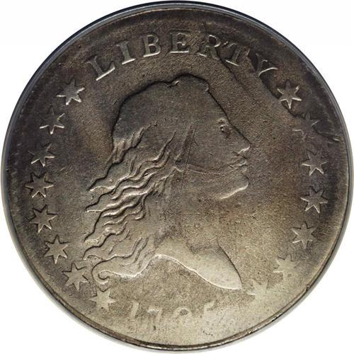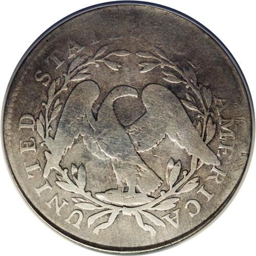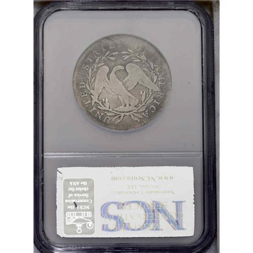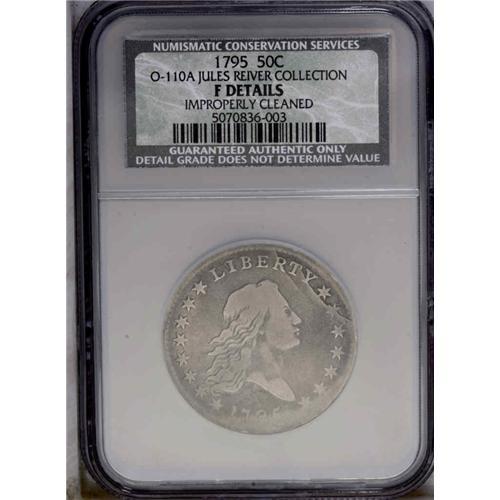<B>1795<50C> 2 Leaves. O-110a, R.4--Improperly Cleaned--NCS. Fine Details.</B></I> On this variety, a die crack has developed from the milling down through the R in LIBERTY and into the field below TY, then through star 11 to the edge. Another has formed from the top of the T down across the base of Y and star 9, then through star 10 to the milling. These two similarly arcing die cracks are clearly visible, even without magnification. Semi-bright light gray surfaces display fine hairlines, and several old pin scratches are located on the Liberty motif. The bottoms of the 95 in the date do not show, nor do the tops of the letters TES in STATES and OF.<BR><I>Ex: Lawver (5/1988).</B></I> Envelope Included.