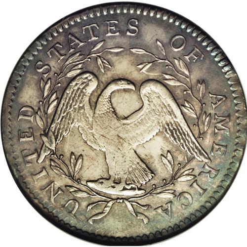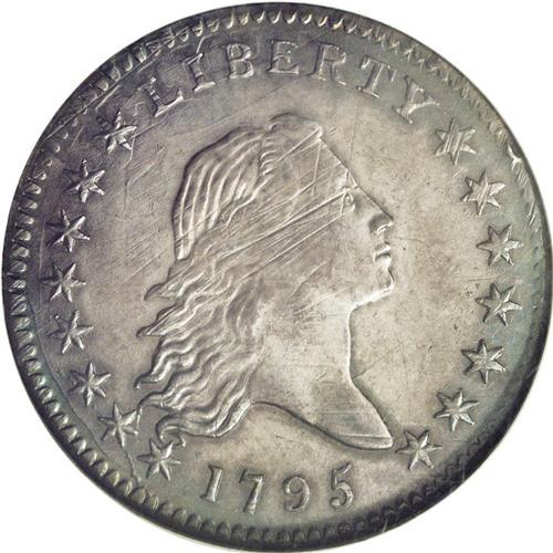 <B>1795<50C> 2 Leaves MS61 NGC.</B></I> O-116, R.5. One of the finer examples of this variety and certainly in the Condition Census of the top six known. Currently there are two slightly finer coins graded, one each as MS62 by NGC and PCGS (these are different specimens), followed by the current coin and two others that have been graded as AU58 just below. This particular coin is toned a dark gray with slightly lighter gray colors near the center. The obverse has adjustment marks on the rim and through Liberty's head, many of which are hidden by her hair. One adjustment mark in particular slides by just above her eye. On the reverse there are a couple of light adjustment marks through the right wing to the eagle's breast, fading away in the fields surrounding. The strike is typical for this variety, with softness on Liberty's upper curls and the eagle's breast and feet. Boldly clashed dies with the obverse showing UNITED clashed along the upper rim and portions of the eagle's wing. Both dies show dentils clashed heavily at the periphery. The obverse die has a broken die crack along the dentils near the first five stars, and another at the tops of RTY and the next two stars. The reverse die was in excellent shape when this coin came between it, although we note a trace of die rust under the right wing of the eagle. A coin that will probably go to a type collection as few variety collectors have the means to purchase coins at this lofty grade level.