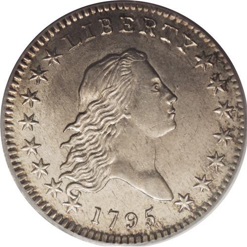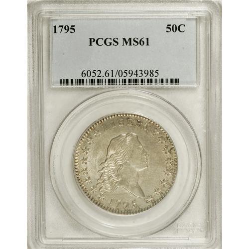 <B>1795 50C 2 Leaves MS61 PCGS.</B></I> O-105, R.4. Two points of star 1 are attached solidly to the lowest curl, and the point of star 2 lies entirely across the end of the second curl from the bottom. On the reverse the berries are arranged 10 and seven, and there is one berry above, one below the R in AMERICA.<BR> After the considerably smaller mintage of 1794 Flowing Hair, Small Eagle half dollars, recorded as 23,464 coins, the fledgling U.S. Mint produced a much larger quantity of 1795 half dollars, recorded as 299,680 pieces. Those recorded mintages are, of course, the numbers of coins produced in each year--not the number of coins <I>dated</B></I> in each of those two years. While 1794's emission produced a total of 11 Overton varieties seen to date, the 1795 mintage, which was 12 times larger, produced only three times as many die marriages--33. While it is understandable that as Mint personnel gained experience in coining the new denomination they would manage to achieve a greater number of coins struck per die, it still appears that the numbers of known varieties compared to the recorded mintages are somewhat askew. Perhaps there were more 1794-dated pieces produced in 1795, making the 1795 rarer than generally acknowledged. While this is speculation, it does seem to square with the available evidence. However, the fact remains that the 1795 half dollars are much less rare than the 1794 pieces, making the 1795-dated pieces the obvious choice to represent the Flowing Hair, Small Eagle type.<BR> The present coin offers original lustrous, mostly untoned surfaces with a light cast of silver-gold over each side. Perusal with a loupe reveals scattered flecks of steel-gray patina. A bit of planchet roughness or die rust is seen near the obverse stars, and a loupe reveals a few scrapes on Liberty's face, cheek, and neck, and a couple more in the right (facing) obverse field. There is, of course, strictly no sign of rub, and this piece, save for the light patina, must appear remarkably similar to the day it dropped from the dies 212 years ago. A piece destined to form the centerpiece of an advanced date or type collection.<BR><BR><b>Shipping:</b> Coins & Currency (<a target="_blank" href="http://www.heritageauctions.com/common/shipping.php">view shipping information</a>)