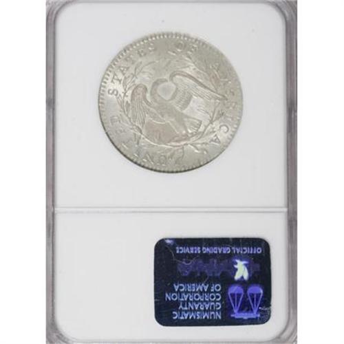 <B>1795 50C 2 Leaves MS64 NGC.</B></I> O-113a, R.3. E over A in STATES. The obverse die is immediately recognized by the heavy die chip between the 5 and final star, and the blundered reverse die is quickly recognized by the engraving error with the A in STATES punched over the E. Who knows what the engraver may have been thinking when he produced this die. Perhaps he thought he was already up to the second T in STATES, and grabbed the E punch by mistake. Most likely, it was a simple mistake that he punched an E instead of an A. Remember that the engraver had to work in reverse, on an extremely small surface, with hand tools rather than the various hubs that are used today. Most likely he punched the final S at the top of the die first, then added he adjacent letter, one at a time, until he had completed the legend.<BR> The obverse is cracked through the tops of LIBERTY. Actually, there are three different die cracks: (1) through the tops of LIB, (2) through the tops of ER, and (3), through the tops of TY. Cracks 2 and 3 join between R and T. A heavy die chip is positioned between the 5 and star 15, below the bust tip, with additional cracks or die flaws through the last four stars on the right. Light clash marks are evident in the obverse fields. The reverse has light die rust and faint clash marks, but no evidence of die cracks.<BR> This is the Eliasberg specimen, considered the finest known 1795 O-113 half dollar, of either the early or late die state. Only two or three Mint State examples of the variety are known. Faint champagne toning over brilliant and frosty silver surfaces. Peripheral obverse and reverse rim disturbances are from the edge lettering process and are strictly as made. Considerable central obverse and reverse weakness is evident, with stronger peripheral details. In the Eliasberg catalog, this writer wrote: "Brilliant and highly lustrous with just a whisper of delicate golden toning. An extremely pleasing coin from a visual aspect. This coin could not have appeared much different during the era in which it was struck!" Today, more than a decade after the Eliasberg catalog was written, the coin remains virtually unchanged, and still looks little different from its appearance over 200 years ago.<BR><I>From The Southwest Collection.</B></I><BR><BR><B>Coin Engraver:</B> Robert Scot<BR><BR><b>Shipping:</b> Coins & Currency (<a target="_blank" href="http://www.heritageauctions.com/common/shipping.php">view shipping information</a>)