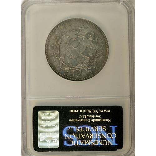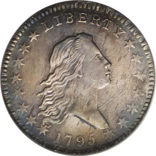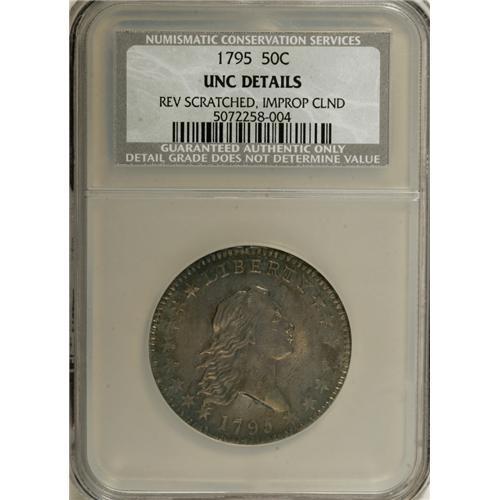 <B>1795 50C 2 Leaves--Reverse Scratched, Improperly Cleaned--NCS. Unc Details.</B></I> O-125, R.4. The rarity rating of this variety indicates that it is one of the common 1795 half dollar die marriages. The Condition Census presented in the fourth edition of the Overton reference suggests that higher grade pieces are elusive, with the best piece recorded as just XF40. However, a few Mint State and AU grade coins are listed by Stephen Herrman in his auction records for the series. This piece has full satin luster with blue-gray and pale gold toning. The reverse scratch discussed by NCS is nothing more than a short scrape below the left wing. Although evidence of cleaning is present on both sides, the overall eye appeal is still quite high.<BR><BR><b>Shipping:</b> Coins & Currency (<a target="_blank" href="http://www.heritageauctions.com/common/shipping.php">view shipping information</a>)