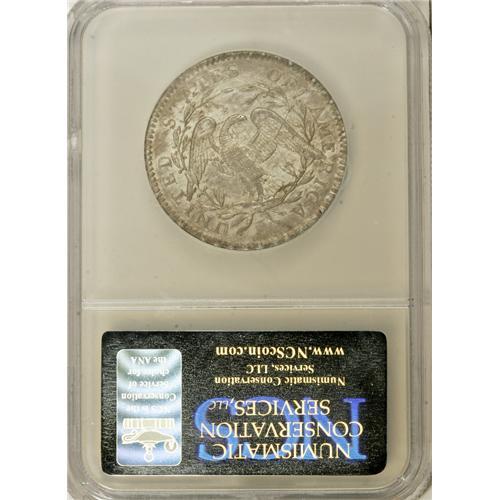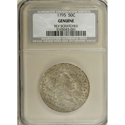 <B>1795 50C 2 Leaves--Reverse Scratched--NCS. Genuine.</B></I> O-125, R.4. The obverse has star 1 piercing the lowest curl and star 15 solidly joined to the bottom side of the bust. A recut leaf below N of UNITED identifies the reverse die. There is no details grade assigned by NCS, but this is actually an amazing piece that has the details of at least AU58, with a valid argument for a full Mint State assessment. Both sides have ivory luster with streaks of pale gold and iridescent toning. The reverse has numerous scratches, as noted on the NCS holder, and these scratches range from light to moderate. Had the reverse remained pristine, this piece would easily qualify as one of the five or six finest known examples of the variety.<BR><BR><b>Shipping:</b> Coins & Currency (<a target="_blank" href="http://www.heritageauctions.com/common/shipping.php">view shipping information</a>)