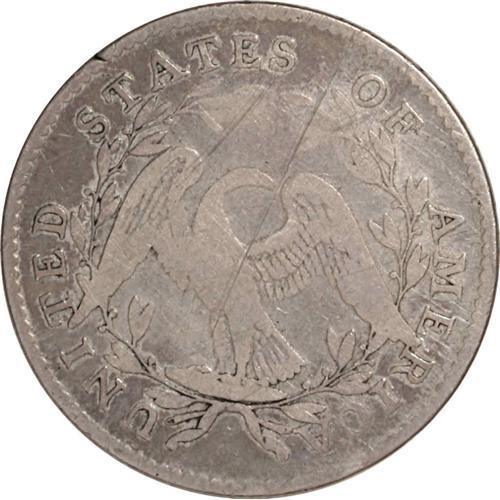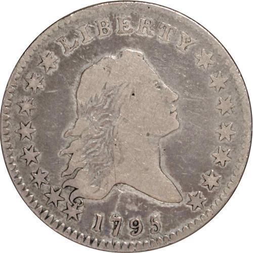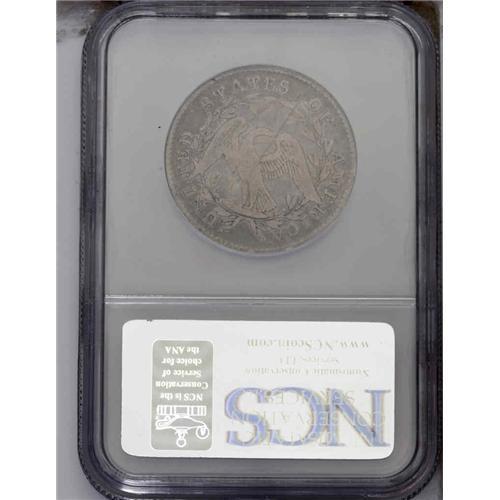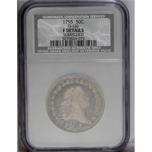 <B>1795<50C> 2 Leaves. O-120, Low R.7--Scratched--NCS. Fine Details.</B></I> A very rare die marriage, listed as R.5 in the Overton reference but now regarded as a stopper to a set of 1795 varieties. The vertical die crack through the 7 in the date is mentioned by Overton. The deep olive-gray fields are lighter near the eagle. The major devices have light lavender-gray color. Ample hair and plumage details persist. A vertical pinscratch through the neck curls and a diagonal scratch near the eagle's beak confirm the NCS notation, other light to moderate abrasions are also present. Other than the minor imperfections, this example is quite similar to the Overton plate example. It is difficult to pinpoint exactly where this coin fits in the Census, but with less than a dozen known examples, its position in the Census is almost moot.<BR><I>Ex: Lloyd (3/15/1972).</B></I> Envelope Included.