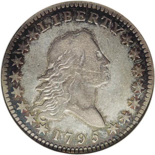 <B>1795<50C> 2 Leaves. O-109, R.4. VF20 NGC.</B></I> This variety is most easily distinguished by two berries on the inside of the right (facing) wreath below the eagle's left wing, one of which is just a lump. Also, a fine, diagnostic horizontal die crack extends from the milling through star 15 to the end of the bust. The obverse die is the same as that of O-108, except in an earlier state, thus O-109 was struck first. The surfaces are bathed in sky-blue, lavender, and golden-brown toning, and the dentilation on both sides is complete and bold. There are no significant abrasions to report.<BR><I>Ex: Julian Leidman (3/1979).</B></I> Envelope Included.