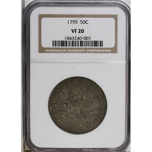 <B>1795 50C 2 Leaves VF20 NGC.</B></I> O-110a, R.4. The die crack through the TY in LIBERTY and two nearby stars identifies this Overton subvariety. A nicely defined cream-gray and autumn-gold Flowing Hair half with smooth, dusky surfaces. A tiny rim nick at 2 o'clock on the reverse is barely worthy of mention.<BR><BR><b>Shipping:</b> Coin/Currency (<a target="_blank" href="http://www.heritageauctions.com/common/shipping.php">view shipping information</a>)