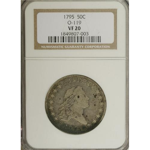 <B>1795 50C 2 Leaves VF20 NGC.</B></I> O-119, R.4. The die lump above the final star aids attribution. This impressively detailed Flowing Hair half is pearl-gray with peripheral charcoal tints. Both sides are smooth for the assigned grade. A few small dark brown obverse spots fail to diminish the eye appeal.<BR><BR><b>Shipping:</b> Coins & Currency (<a target="_blank" href="http://www.heritageauctions.com/common/shipping.php">view shipping information</a>)