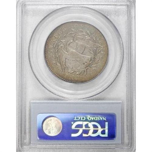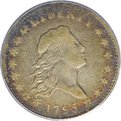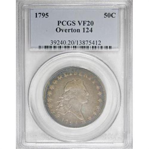 <B>1795 50C 2 Leaves VF20 PCGS.</B></I> O-124, R.5. This variety is characterized by star 15 being joined to the bust on the obverse, and on the reverse by the 8-8 berry arrangement. Two other 8-8 reverses are known from this year, one has two berries inside the right part of the wreath (O-107) and the other (O-115) shows a curved die defect to the right of OF. The reverse of this variety shows a small elongated die defect lump just above the tip of the lowest leaf on the right. Both sides have light clash marks but no signs of die cracks. <BR> Interesting toning is seen on each side with light silver-gray in the center. The obverse has champagne color with dusky russet and blue toning near the border, the reverse is mostly champagne with only a trace of russet and sky-blue. <BR> The Condition Census in the fourth edition of Overton is listed as 45, 25, 20, 15, 10. However, recent sales and auction appearances have expanded the Condition Census to include a couple of higher grade pieces. The top five coins listed in Stephen Hermann's list of notable coins are 55/55, 55/55, 40/40, 20/20, 20/20. <BR> Haseltine-17; Beistle 12-Q; Overton-52; Hilt 14-M; PCGS# 6052; Encyclopedia-4553.<BR><I>Ex: Alpine Numismatics (3/2004).<BR>From The Westmoreland County Collection of Early Bust Halves, 1794-1807.</B></I><BR><BR><B>Coin Engraver:</B> Robert Scot<BR><BR><b>Shipping:</b> Coins & Currency (<a target="_blank" href="http://www.heritageauctions.com/common/shipping.php">view shipping information</a>)