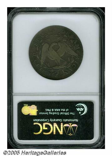 <B>1795<50C> 2 Leaves VF25 NGC.</B></I> O-102, R.5. Deep chestnut and aquamarine colors embrace this impressive second year Half Dollar. Attractive definition is present within Liberty's hair and the eagle's wings and tail. Close examination only locates one minor abrasion, a pinscratch concealed on the back of the lower curls. Although 1795 Half Dollars are always available for a price, they are often collected by variety, and demand is ceaseless from type set assemblers.