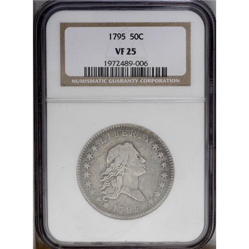 <B>1795<50C> 2 Leaves VF25 NGC.</B></I> O-110, R.4. Recut 9 in the date and 9x8 berry arrangement on the reverse, with 2 inside berries beneath each wing. This pleasing mid-grade representative displays balanced wear and natural gray color that lightens somewhat on the design elements. Expect strong competition on this problem-free early type coin. <BR><BR><B>Important notice:</B> Heritage usually auctions material at the rate of 200-250 lots per hour. On some occasions eBay Live bid software or the Internet may not be able to keep up with the pace of the auction. We recommend placing a realistic absentee bid now as insurance to avoid disappointment. Occasionally the auctioneer may eliminate or reject an eBay Live bid, and the auctioneer may also reopen a lot after the close of the eBay live bidding (usually because we missed an audience bid), and may reject your bid even if it shows you as the winning bidder. By bidding via eBay Live, you agree that Heritage may award the lot to another bidder at its sole discretion under the circumstances described above or any other reasonable circumstances. Since eBay bids are not shown to us until we open the lot on the floor, we treat those bids just like floor bids. In most cases the floor responds before the eBay bid is presented to us, due to Internet lag time, so for consistency we have made it a policy that floor bids are always considered first over tie eBay live bids. Also please note that all Heritage lots purchased through eBay Live carry a 20% Buyer's Premium. Please make sure you read the Terms and Conditions before you bid. This lot is being auctioned in conjunction with a live floor auction by Heritage Galleries & Auctioneers. All final auction and invoice information will be supplied by Heritage Galleries & Auctioneers, and all other information should be considered preliminary. Lot:1922 <BR><BR><B>Winning Notification and Billing:</B> After the FINAL session in this auction is complete, Heritage will send e-mail and snail mail invoices. This process normally takes several days. All final auction and invoice information will be supplied by Heritage Galleries & Auctioneers, and all other information should be considered preliminary. <BR><BR>This auction will be conducted on a live auction floor and over the Internet through eBay Live. If you choose to place an absentee bid, please take a moment to <font color='#0000ff'><u><a href='http://pages.ebay.com/liveauctions/help/before/laabsentee.html'>learn how eBay Live absentee bidding works</a></u></font><font color='#000000'>