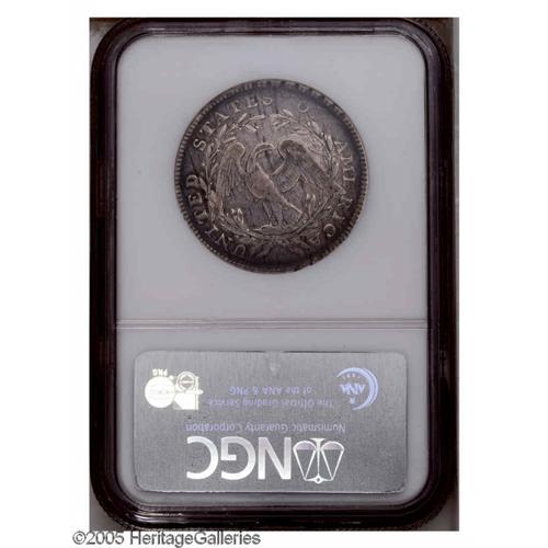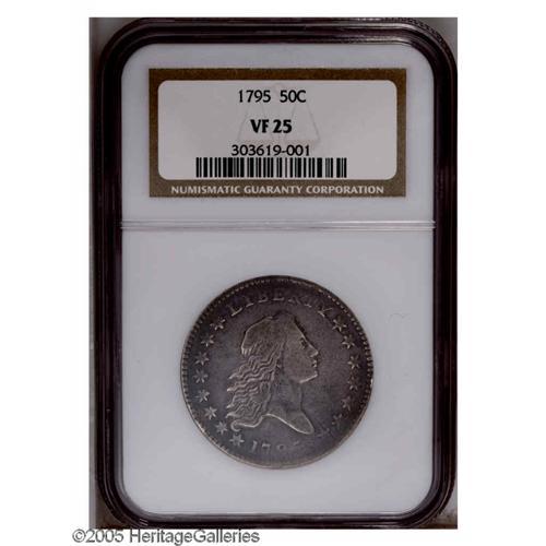 <B>1795<50C> 2 Leaves VF25 NGC.</B></I> O-110a, R.4. A pair of bold die cracks on the upper right obverse field identify the later die stage. A smooth dove-gray example with impressive definition on Liberty's hair. The bottom of the date and the top of OF is not fully brought up, the remainder of the legends are sharp. A couple of faint mint-made adjustment marks near the date, and some pinpoint marks on the profile are visible only beneath a glass. Overall, a pleasing piece from the second and final year of the Flowing Hair type.