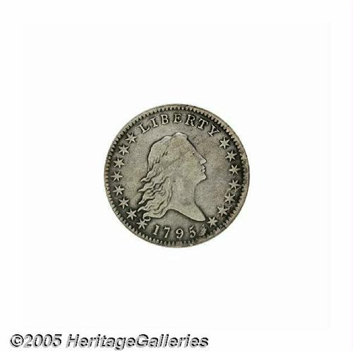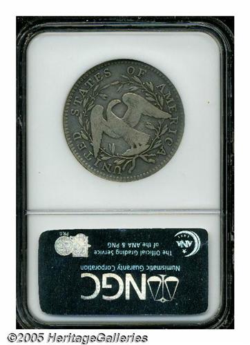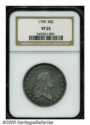 <B>1795<50C> 2 Leaves VF25 NGC.</B></I> O-113a, R.4. Bold for the assigned grade, this cream-gray representative has a few faint slide marks and mint-made adjustment marks on the central reverse. Overton-113 is the popular variety with the A in STATES over a plainly visible E. Perhaps even more easily recognized is a conspicuous die lump between the date and star 15. This later die state reveals some roughness about the last few stars and faint die cracks that nearly connect the tops of all the letters in LIBERTY.