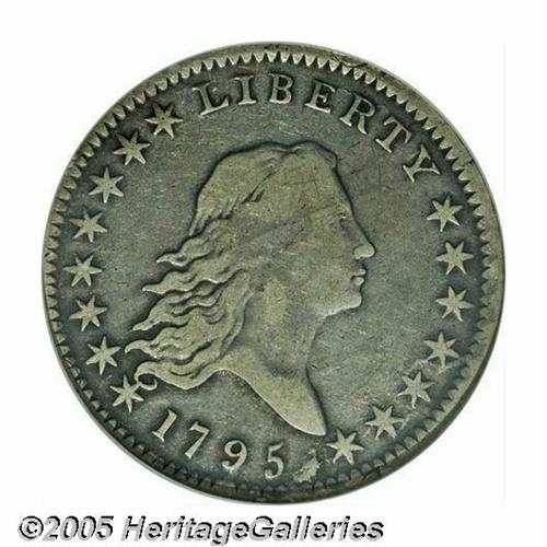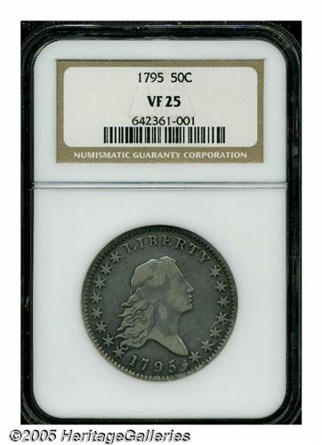 <B>1795<50C> 2 Leaves VF25 NGC.</B></I> O-113a, R.4. One of the more common of many 1795 varieties, popularized by the recutting of the A in STATES over a plainly visible E. Perhaps even more easily recognized is a conspicuous die lump between the date and star 15. This later die state reveals some roughness about the last few stars and faint die cracks that nearly connect the tops of all the letters in LIBERTY. This is a well balanced medium gray example with a few short adjustment marks across the lower portion of the eagle.