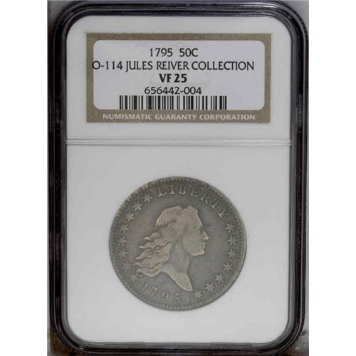 <B>1795<50C> 2 Leaves. O-114, R.6. VF25 NGC.</B></I> Die break below bust tip. No outside berry between D and S, the only such die found among all 1795 half dollars. Without a single exception, every other known reverse die used in the 1795 Half Dollar coinage has a berry in that position. This rare variety shares the obverse die from Overton-113, but is an earlier die state with a smaller die break beneath the bust tip.<BR> Among the very finest examples of this variety known. Far finer than the plate coin in the third edition of Overton, and also clearly finer than any example auctioned over the past 15 years. According to Steve Herrman's list, only five examples have been offered for auction sale since 1992, and the finest of those was just VG10. This example is a bit optimistically graded, and yet it is still one of the three or four finest known. Battleship-gray devices are lighter in color than the deep blue-green and plum fields. Trivial marks are detected on both sides.<BR><I>Ex: Julian Leidman; David Davis (7/31/1979). Possibly earlier from Don Frederick.</B></I> Envelope Included.
