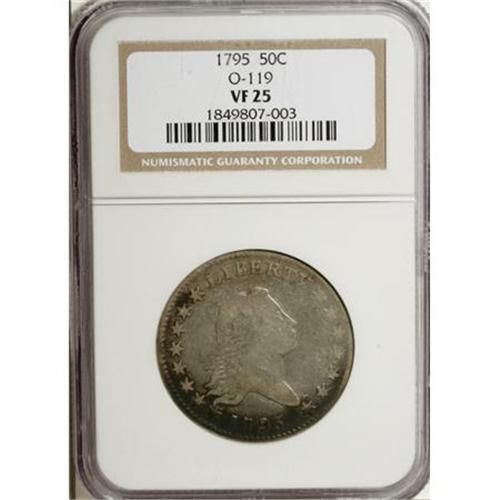 <B>1795 50C 2 Leaves VF25 NGC.</B></I> O-119, R.4. Identified by repunching on the I in UNITED and a die lump above the final star. The obverse is mostly slate-gray despite an arc of deep russet along the lower border. The reverse is cream-gray with a generous blush of lilac and an upper glimpse of cobalt-blue.<BR><BR><B>Coin Engraver:</B> Robert Scot<BR><BR><b>Shipping:</b> Coins & Currency (<a target="_blank" href="http://www.heritageauctions.com/common/shipping.php">view shipping information</a>)