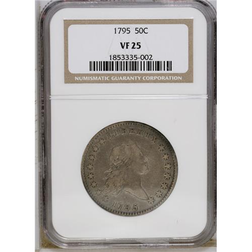 <B>1795 50C 2 Leaves VF25 NGC.</B></I> O-131, High R.4. This deep golden-brown and cream-gray Flowing Hair half has pleasing sharpness on the portrait. The eagle's right (facing) wing is indistinct in places, but the devices and legends are nicely defined overall. There are no relevant marks.<BR><BR><b>Shipping:</b> Coin/Currency (<a target="_blank" href="http://www.heritageauctions.com/common/shipping.php">view shipping information</a>)