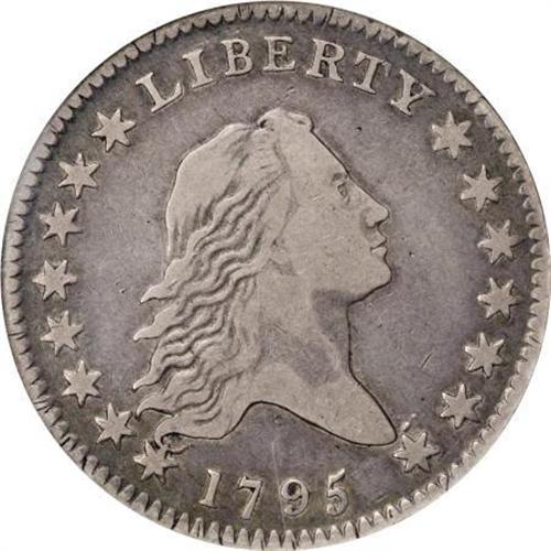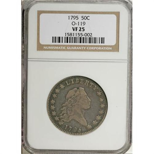 <B>1795 50C 2 Leaves VF25 NGC.</B></I> O-119, R.4. Star 15 points just above the bust tip, with a oblong die chip just above that star point. I in UNITED is sharply recut to the left. A relatively common variety, O-119 is often found in higher circulated grades. Unlike most, this piece has pleasing pewter-gray surfaces, framed by gray-gold color.<BR><I>Ex: Gary Sturtridge (House of Stuart, Ltd.).</B></I><BR><BR><B>Coin Engraver:</B> Robert Scot<BR><BR><b>Shipping:</b> Coins & Currency (<a target="_blank" href="http://www.heritageauctions.com/common/shipping.php">view shipping information</a>)