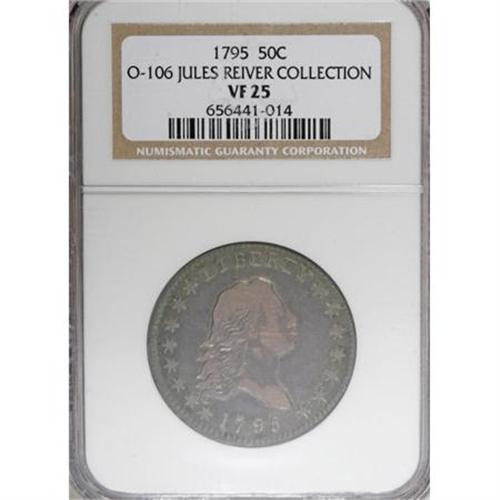 <B>1795 50C 2 Leaves VF25 NGC.</B></I> O-106, R.6. This use of Obverse 1 represents a later die state than when it was used for O-101, O-102, and O-103. The die crack from the end of the bust to the milling, just left of star 15, is more pronounced, as are other obverse die cracks. The reverse is easily recognized by a diagnostic bisecting die crack from the edge at I of AMERICA, through the right (facing) wing, the eagle's neck, and through the A in STATES to the edge. The portion of the reverse northwest of the crack is on a slightly higher plane, suggesting that part of the die had sunk slightly. As a result, the coin was not quite as sharply struck in that area, and also was subject to more pronounced effects of circulation. <BR>A combination of bluish-gray, pink-rose, and golden-brown patination is seen over each side. Well centered, with nicely detailed motifs that are consistent with the grade. A few minute marks scattered over each side do not distract. This is certainly a Condition Census example, and probably ranks as third or fourth finest known.<BR>Haseltine-25; Beistle 1b-D; Overton-14; Hilt 20-T; PCGS# 6052; Encyclopedia-4560.<BR><I>Ex: Julian Leidman; David Davis (7/1979); Jules Reiver (Heritage, 1/2006), lot 22485. Possibly earlier from Donald Frederick.<BR>From The Westmoreland County Collection of Early Bust Halves, 1794-1807.</B></I><BR><BR><B>Coin Engraver:</B> Robert Scot<BR><BR><b>Shipping:</b> Coins & Currency (<a target="_blank" href="http://www.heritageauctions.com/common/shipping.php">view shipping information</a>)