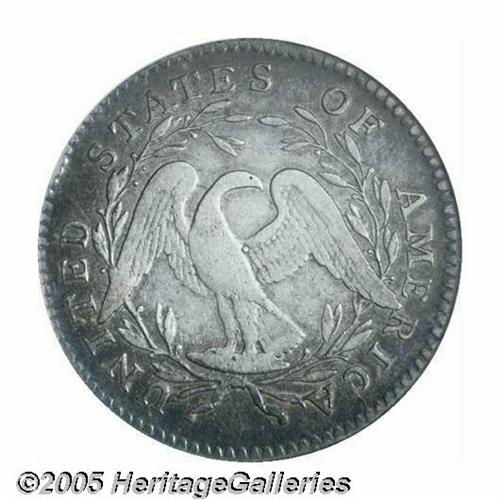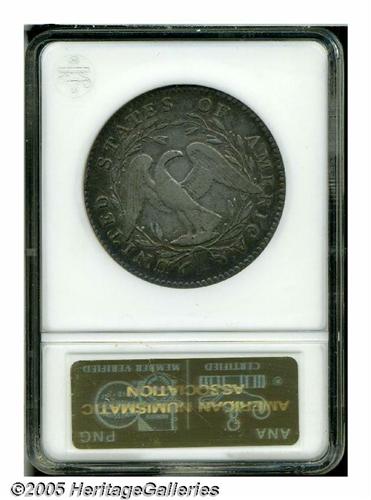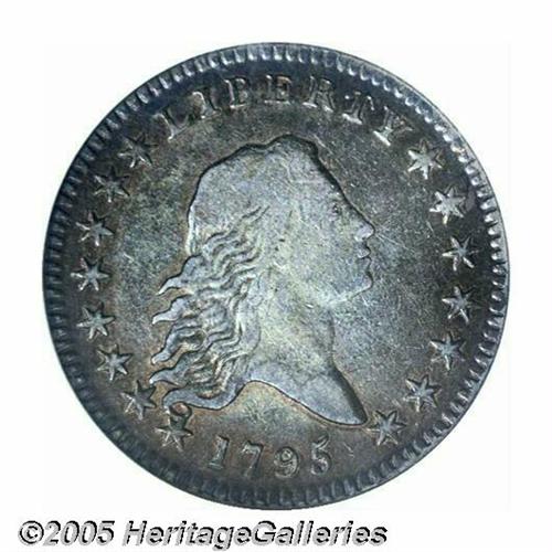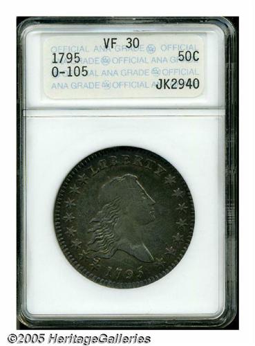 <B>1795<50C> 2 Leaves VF30 ANACS.</B></I> O-105, R.4. Attractive olive, sky-gray, and golden-brown colors enrich this pleasing Flowing Hair Half Dollar. The wings and hair have abundant remaining details. Thorough evaluation reveals a few unimportant old handling marks in the fields. In an old ANA cache holder.