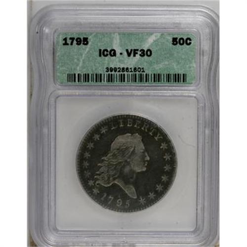 <B>1795 50C 2 Leaves VF30 ICG.</B></I> O-102, R.4. A charcoal-gray Flowing Hair half that benefits from unmarked fields. The portrait possesses pleasing hair detail, and some plumage is evident on the eagle's wings and tail. The devices display a few inconsequential marks. A collectible example of this ever-popular early silver type.<BR><BR><B>Coin Engraver:</B> Robert Scot<BR><BR><b>Shipping:</b> Coins & Currency (<a target="_blank" href="http://www.heritageauctions.com/common/shipping.php">view shipping information</a>)