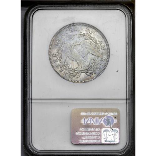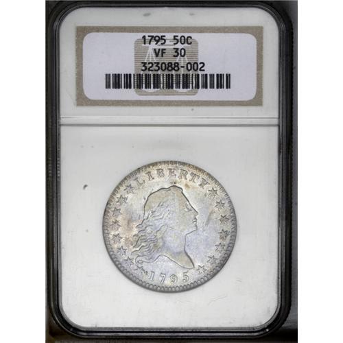 <B>1795<50C> 2 Leaves VF30 NGC.</B></I> O-108a, R.4. This variety is characterized by several die defects around star 1 and a rim break on the reverse that covers several segments of the milling below the right (facing) ribbon. A light die crack through the tops of AME of AMERICA confirms the later die state. A mix of golden-gray and powder-blue dominates each side. Well centered, and strong dentilation on both sides. The design elements retain nice detail, though the star centers and the eagle's torso are flat. A few small indentions are noted on the lower and central reverse, and wispy slide marks on both faces are mentioned for accuracy. Overall, a pleasing early half dollar. <BR><BR><B>Important notice:</B> Heritage usually auctions material at the rate of 200-250 lots per hour. On some occasions eBay Live bid software or the Internet may not be able to keep up with the pace of the auction. We recommend placing a realistic absentee bid now as insurance to avoid disappointment. Occasionally the auctioneer may eliminate or reject an eBay Live bid, and the auctioneer may also reopen a lot after the close of the eBay live bidding (usually because we missed an audience bid), and may reject your bid even if it shows you as the winning bidder. By bidding via eBay Live, you agree that Heritage may award the lot to another bidder at its sole discretion under the circumstances described above or any other reasonable circumstances. Since eBay bids are not shown to us until we open the lot on the floor, we treat those bids just like floor bids. In most cases the floor responds before the eBay bid is presented to us, due to Internet lag time, so for consistency we have made it a policy that floor bids are always considered first over tie eBay live bids. Also please note that all Heritage lots purchased through eBay Live carry a 20% Buyer's Premium. Please make sure you read the Terms and Conditions before you bid. This lot is being auctioned in conjunction with a live floor auction by Heritage Galleries & Auctioneers. All final auction and invoice information will be supplied by Heritage Galleries & Auctioneers, and all other information should be considered preliminary. Lot:1923 <BR><BR><B>Winning Notification and Billing:</B> After the FINAL session in this auction is complete, Heritage will send e-mail and snail mail invoices. This process normally takes several days. All final auction and invoice information will be supplied by Heritage Galleries & Auctioneers, and all other information should be considered preliminary. <BR><BR>This auction will be conducted on a live auction floor and over the Internet through eBay Live. If you choose to place an absentee bid, please take a moment to <font color='#0000ff'><u><a href='http://pages.ebay.com/liveauctions/help/before/laabsentee.html'>learn how eBay Live absentee bidding works</a></u></font><font color='#000000'>