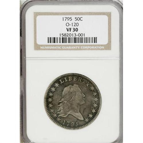 <B>1795 50C 2 Leaves VF30 NGC.</B></I> O-120, High R.6. Possibly Low R.7 as Stephen Herrman states that 12 to 13 are known, bridging the border between R.6 and R.7. The Westmoreland County coin offered here is believed the second finest known, although it may rank third. This "Extremely Rare" variety displays the upper right point of star 1 completely piercing the lowest curl, star 2 and the second curl are point to point, and a fine die crack is seen from the edge through the 7 to the bust. On the reverse, recutting occurs on the CA in AMERICA, and the lower leaf is connected to the lower right serif of the left stand of the last A.<BR> Medium gray toning in the fields accents the lighter silver-gray design elements. The smooth surfaces are remarkably clean for a moderately circulated coin, and are completely devoid of adjustment marks. Indeed, we only mention a minute mark between the bridge of Liberty's nose and star 9 for pedigree identification purposes. Sharp detail is noted on the devices, including most of Liberty's hair strands, the eagle's plumage, and the dentils on both sides. This marvelous Choice VF example exhibits excellent technical quality and aesthetic appeal.<BR> Haseltine-27; Beistle 14-P; Overton-45; Hilt 9-E; PCGS# 6052; Encyclopedia-4553.<BR><I>Ex: Michael Summers (7/1999).<BR>From The Westmoreland County Collection of Early Bust Halves, 1794-1807.</B></I><BR><BR><B>Coin Engraver:</B> Robert Scot<BR><BR><b>Shipping:</b> Coins & Currency (<a target="_blank" href="http://www.heritageauctions.com/common/shipping.php">view shipping information</a>)