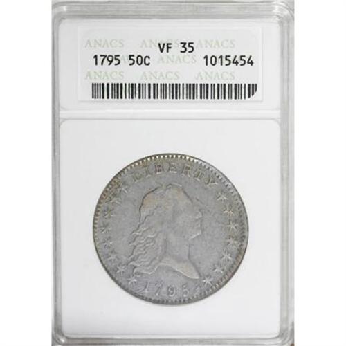<B>1795 50C 2 Leaves VF35 ANACS.</B></I> O-113a, R.4. This is the late die state for this variety. The "broken patch" between the date and star 15 has become larger, and is now connected to the tip of Liberty's bust and, faintly, to the lower right edge of 5. Blunt die cracks also occur now between stars 12 through 15, and a die crack extends along the top of LIBERTY. The reverse displays a plethora of interesting characteristics that include die chips near and between STATES and UNITED; a distinctly granular texture to the surfaces just below the eagle's wings; a spindly die crack that extends along the bottom of the eagle's rock; and several faint die clash marks above the eagle's head and left (facing) wing, as well as below the wing. <BR>The obverse is toned in pastel shades of blue-green and rose, with tan color on the highpoints. The reverse shows a dappled arrangement of gold, amber, steel-green, and brown patina. The central devices are evenly worn and there are no severe marks on either side of this pleasing Choice VF example. <BR>Haseltine-5; Beistle 5a-I; Overton-32; Hilt 15-Q; PCGS# 6052; Encyclopedia-4559.<BR><I>Ex: Harry Laibstain.<BR>From The Westmoreland County Collection of Early Bust Halves, 1794-1807.</B></I><BR><BR><B>Coin Engraver:</B> Robert Scot<BR><BR><b>Shipping:</b> Coins & Currency (<a target="_blank" href="http://www.heritageauctions.com/common/shipping.php">view shipping information</a>)
