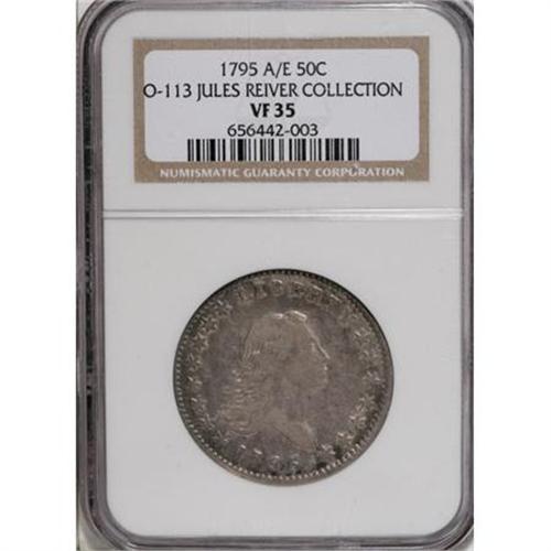 <B>1795 50C A over E in STATES, 2 Leaves VF35 NGC.</B></I> Ex: Jules Reiver Collection. O-113a, R.4. The blundered reverse die, with the A in STATES cut over an E, is unique among the reverse dies of 1795 half dollars. It is equally as desirable as the similar E over A variety of 1814 half dollars, and the S over D in STATES variety of 1795 half eagles. The obverse die is also quickly attributed by Overton's "rough broken patch" between the 5 in the date and the final star. This later die state shows a faint die crack connecting the tops of LIBERTY and a series of shallow die defects from stars 12 to 15. The light cream-gray surfaces have surprisingly few marks, although the reverse field exhibits trivial verdigris.<BR><I>Ex: Jules Reiver Collection (Heritage, 1/06), lot 22494.</B></I><BR><BR><B>Coin Engraver:</B> Robert Scot<BR><BR><b>Shipping:</b> Coins & Currency (<a target="_blank" href="http://www.heritageauctions.com/common/shipping.php">view shipping information</a>)