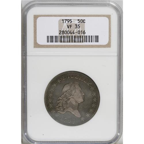 <B>1795 50C 2 Leaves VF35 NGC.</B></I> O-119, R.4. The reverse has I of UNITED recut with a leaf joining the base of this letter, a diagnostic feature not found on any other 1795 variety. This piece has pleasing gray-brown color, deeper near the borders, with lighter gray on the devices. A thin hairline is visible in the right obverse field, but otherwise the surfaces are essentially problem-free.<BR><BR><b>Shipping:</b> Coin/Currency (<a target="_blank" href="http://www.heritageauctions.com/common/shipping.php">view shipping information</a>)
