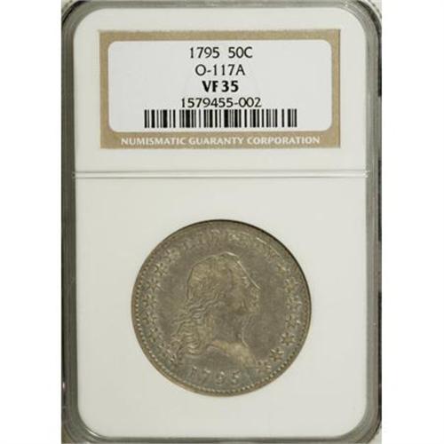 <B>1795 50C 2 Leaves VF35 NGC.</B></I> O-117a, R.4. The heavy die crack from the bust to the edge midway between the 5 in the date and star 15 confirms the die state. As mentioned in Overton's third edition, a finer crack from this one joins the top of 95. Overton further indicates: "Later states also show a crack from edge across curls and out to edge at star 5. Still another fine crack at bottom of 17." This example evidently is not of a later die state, as these cracks are not apparent.<BR> Pleasing light to medium gray color in the fields highlights the motifs, more so on the obverse. Strong definition is especially apparent on Liberty's hair strands, and in the eagle's tail feathers, as well as those in the interior portion of the wings. The design elements are nicely centered on the planchet, and the dentilation is relatively strong on both sides. A few inoffensive marks are visible on Liberty's cheek and neck. All in all, a lovely midgrade specimen that is sure to draw the attention of early half dollar aficionados.<BR> Haseltine-11; Beistle 11a-P; Overton-40; Hilt 10-E; PCGS #6052; <I>Encyclopedia</B></I>-4553.<BR><I>Ex: Northeast Numismatics (6/1999).<BR>From The Westmoreland County Collection of Early Bust Halves, Part Two.</B></I><BR><BR><b>Shipping:</b> Coins & Currency (<a target="_blank" href="http://www.heritageauctions.com/common/shipping.php">view shipping information</a>)