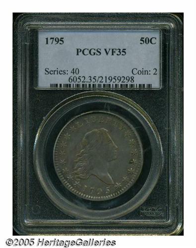 <B>1795<50C> 2 Leaves VF35 PCGS.</B></I> O-109, R.4. This variety is most easily distinguished by two berries on the inside of the right wreath below the eagle's wing, one of which is just a lump. Also, a die scratch protrudes from the topmost berry on the right. Light, even wear is seen over the highpoints of the devices and the surfaces are gray-lilac with golden accents around the design elements. A few light adjustment marks are seen on the reverse.