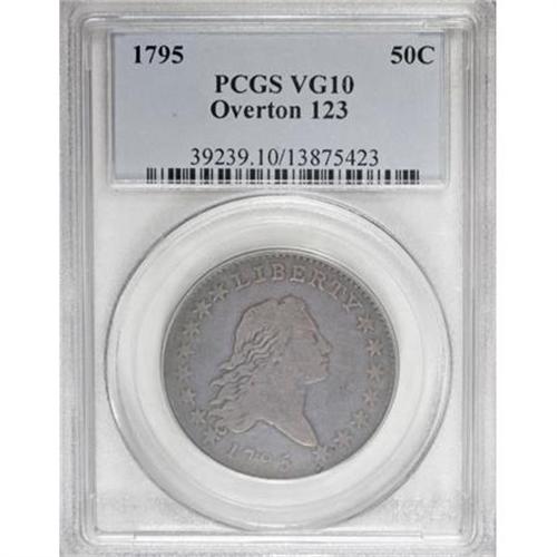 <B>1795 50C 2 Leaves VG10 PCGS.</B></I> O-123b, Low R.7. The obverse has two short die cracks below the shoulder. The reverse has a heavy die crack at S OF, reaching the border near A, and a branch to the border left of O. The area above the main crack and left of the branch crack appears to form a full rim break, while the area above the main crack and right of the branch forms a retained cud. This is a fascinating study piece for the die state enthusiast.<BR><B> While as many as nine examples of the O-123 die marriage are currently known, this variety is apparently unique with the reverse rim break.</B></I><BR> Both sides have deep pewter surfaces with no readily visible imperfections. This is an attractive, wholesome example of this apparently unique die state, and one that was not represented in the Jules Reiver Collection.<BR> Haseltine-29; Beistle 16-Xa; Overton-49; Hilt 12-I; PCGS# 6052; Encyclopedia-4556.<BR><I>Ex: Michael Summers (2/2005).<BR>From The Westmoreland County Collection of Early Bust Halves, 1794-1807.</B></I><BR><BR><B>Coin Engraver:</B> Robert Scot<BR><BR><b>Shipping:</b> Coins & Currency (<a target="_blank" href="http://www.heritageauctions.com/common/shipping.php">view shipping information</a>)